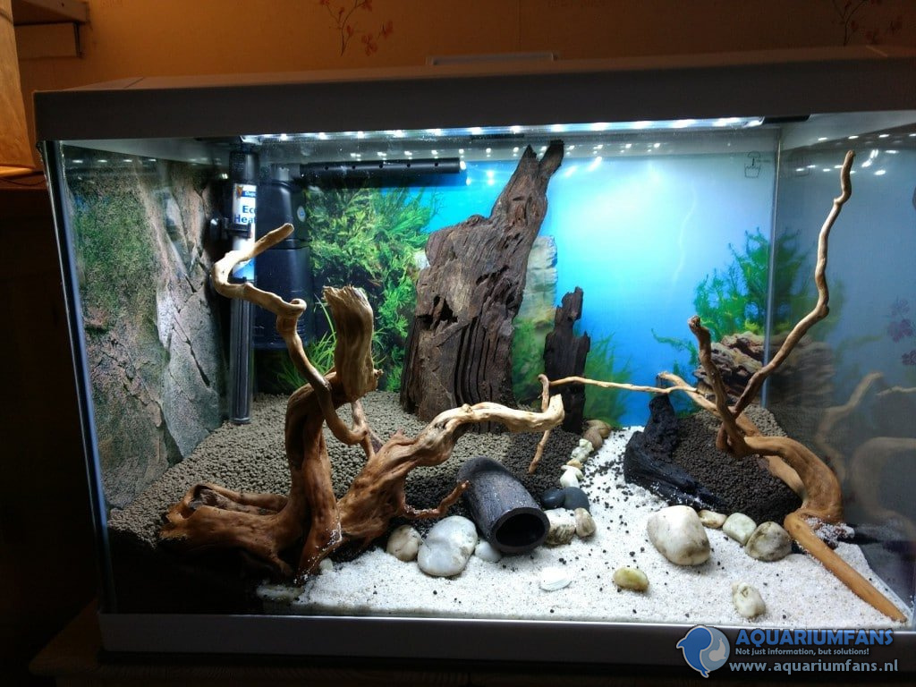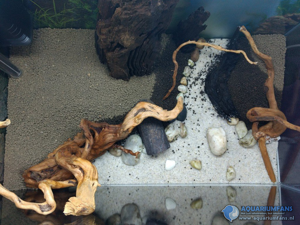 Natuurlijk, past in het biotoop. Mooi. Contrast met de planten. Veilige plaatsen voor de vissen.