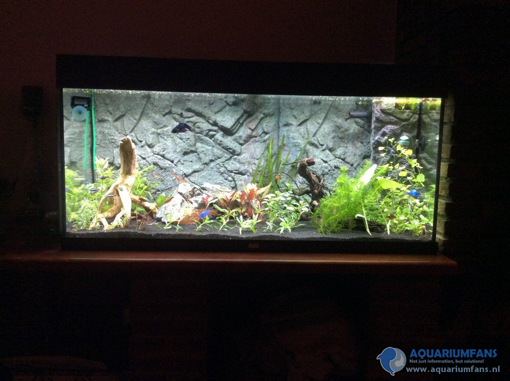 Ik begrijp dat jouw aquarium vooral een decoratieve functie heeft. Daar is niks mis mee. In de aquariumwereld worden bepaalde standaarden gehanteerd, waaraan niemand zich uiteraard hoeft te houden, maar je hebt relatief veel verschillende plantensoorten in deze bak. Het kan meer rust creëren wanneer je met wat minder soorten zou werken en wat grotere groepen zou maken. Mooie achterwand, zeker in combinatie met de kleur van de bodem. Veel plezier met dit project !!