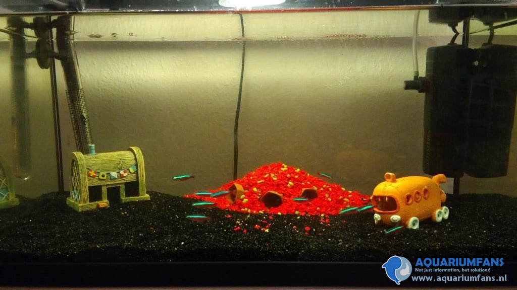 Eigenlijk is je volgorde niet helemaal juist. Eerst de bak inrichten, in laten draaien, en dan pas de vis. De vis moet eigenlijk altijd “in een gespreid bedje” komen. Nu moet je nog steeds weken in de bak en dat vinden ze niet fijn. Wel goed dat je de kardinalen in een schooltje houd. Zou je die “toys” in je bak niet liever vervangen door een paar mooie planten? (volgens mij hoorde ik die kardinalen zoiets vragen !!!!) Succes !!