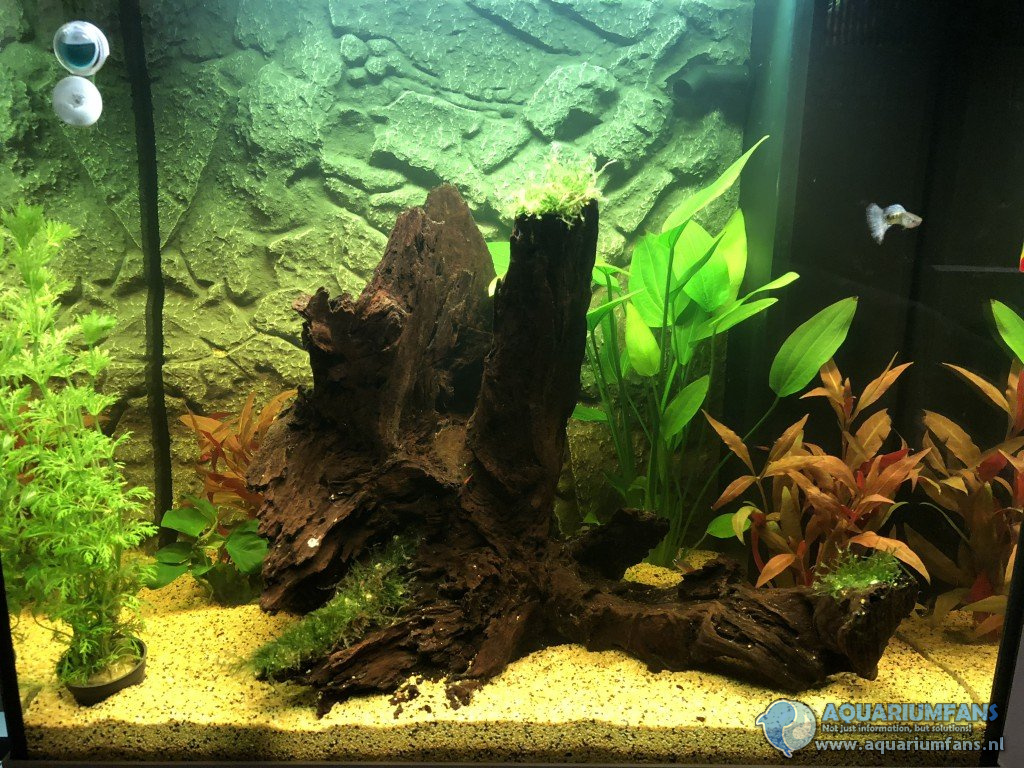 Lekker sfeervol aquarium. Zo’n groot stuk hout “doet” het altijd wel goed. Houd in de gaten dat er zich onder dat hout vuil kan verzamelen. Houd het hout zelf ook goed in de gaten. Het kan op langere termijn als gevolg van rottingsprocessen weleens de oorzaak worden van algenproblemen. Heel verstandig om er niet teveel vissen in te doen. Succes, houd ons op de hoogte !!