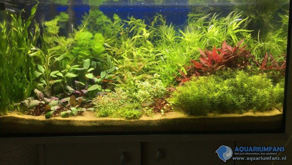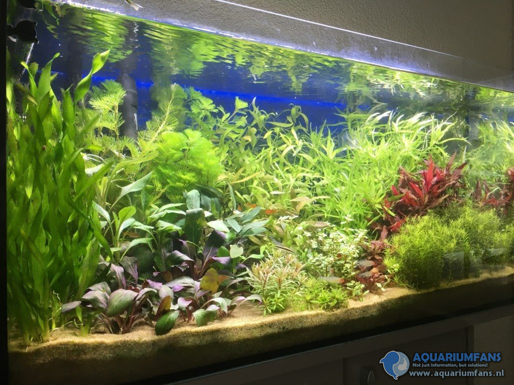 Gave inrichting hoor! Opvallend vind ik je blauwe achterwand; niet veel gezien, maar hier doet ‘ie het geweldig! En ik weet niet of het toeval is, maar er bestaat een echte richtlijn wat deze stijl betreft: bij de inrichting geldt dat het aantal soorten planten ongeveer 1 soort per 10 cm lengte van het aquarium is. Daar mogen dan de solitairen bij worden opgeteld. Helemaal goed dus!