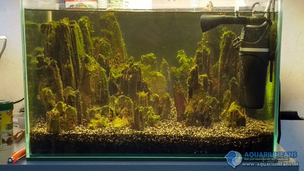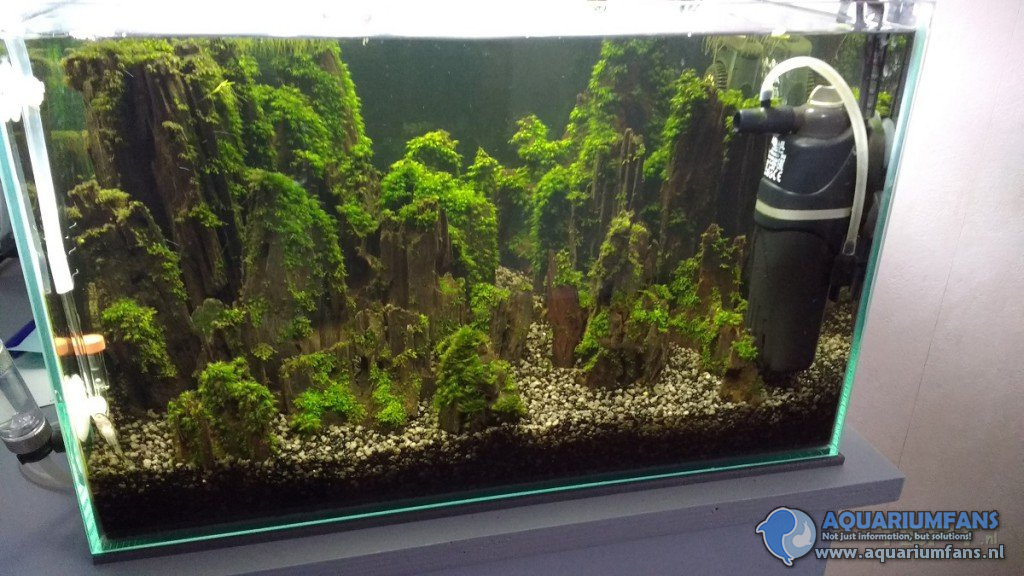 Deze aquascape is opgebouwd met driftwood en bekleed met mossen.