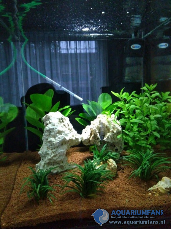 Fris, vers ingericht bakje. Heb je de planten wel uit de potjes gehaald? Goed dat jij je beperkt tot een of twee vissoorten. Dat geeft rust en is beter voor de vissen. Heb je de stenen getest om te weten of ze kalk afgeven aan het water. Dat kan je doen door er wat zuur op te druppelen. Is wel belangrijk om de waterkwaliteit te kunnen waarborgen. Veel plezier met de hobby !!