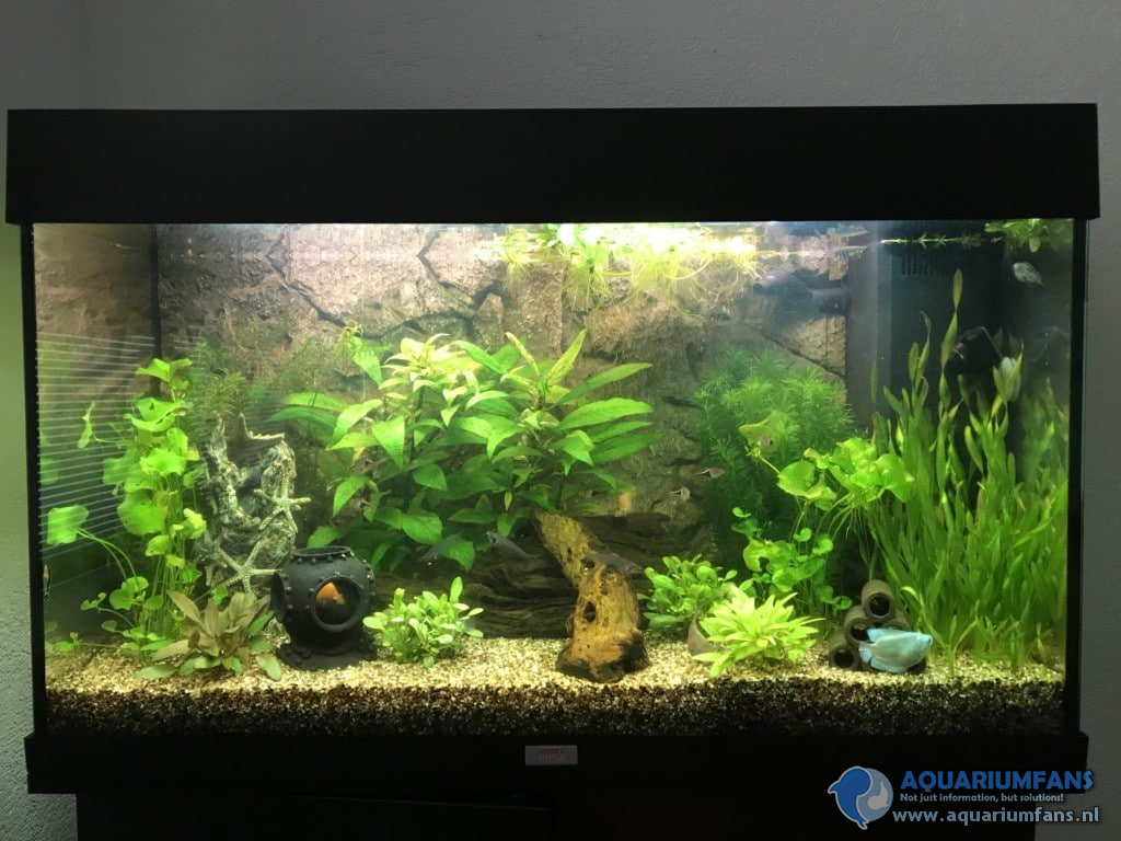 Ook hier zou ik adviseren om voorruit tot de hoogte van de bodem af te plakken. Ik vind de bak leuk ingericht en ik vind dat je gekozen hebt voor een leuk en gevarieerd visbestand. Kijk uit met die Colisa’s, dat kunnen onderling verschrikkelijke etterbakken zijn. Mannetjes kunnen mekaar tot de dood toe het leven zuur maken en vrouwtjes worden vaak tot vervelens toe achterna gejaagd. Veel plezier met deze bak !!