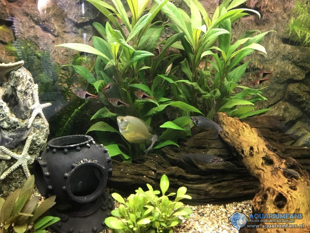 Wij hebben een gezelschap aquarium van 125 liter en ik hou van groen(platen) en gezelligheid in het aquarium. Wij hebben meerdere soorten vissen in het aquarium. Naast vissen hebben wij ook garnalen, 1 kreeftje en Helena slakken in ons aquarium.