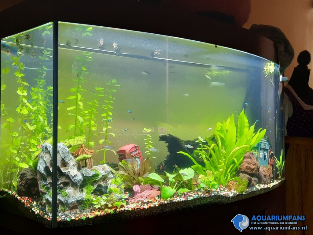 In het begin was dat sowieso draadalg, maar mijn garnalen en slakken hebben prima werk afgeleverd! Nu is het vooral dat ik nog geen passend opzetstuk voor mijn kraan heb kunnen vinden, dus bij elke waterwissel met emmers moet blijven sjouwen...