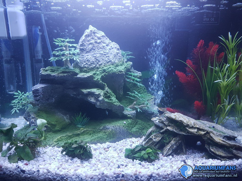 1. Lekker sfeertje in deze scape !! Die rode plant zal het wel moeilijk hebben gehad, of niet? Deze bak straalt rust uit. Rust die een beetje wordt doorbroken door de zuurstofbelletjes. Leuke, wat geheimzinnige grotten heb je gecreëerd.