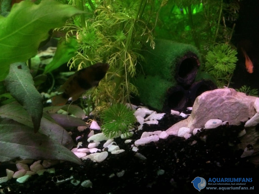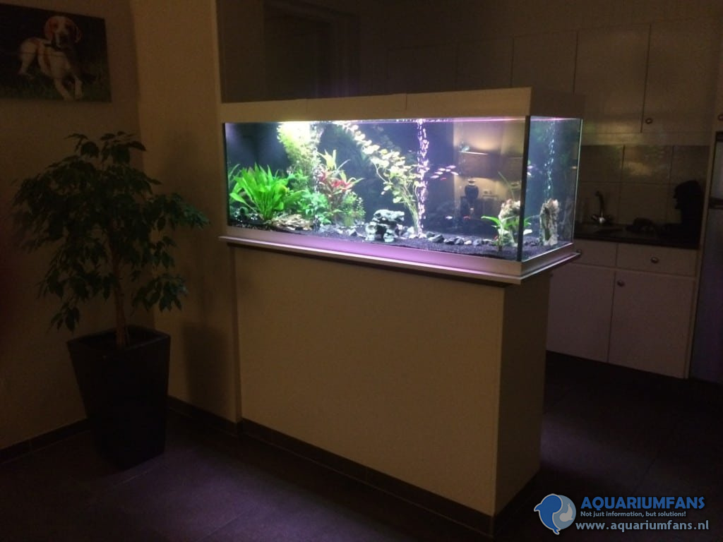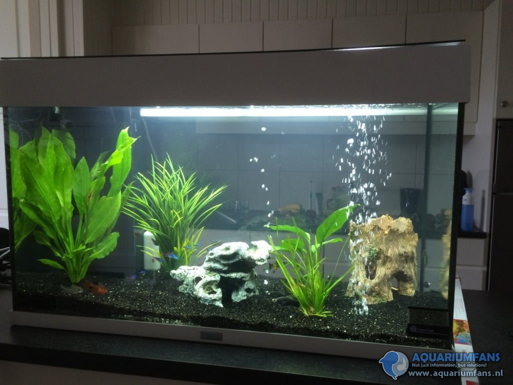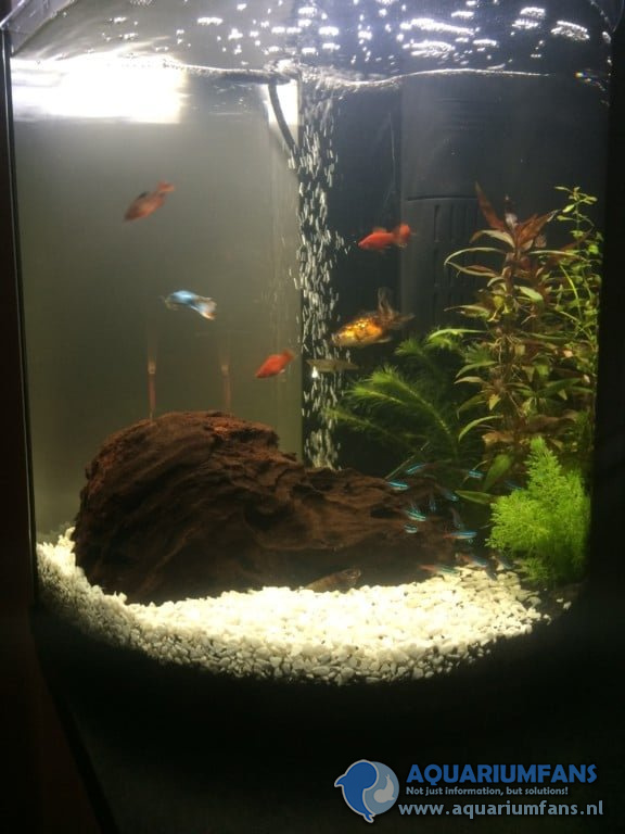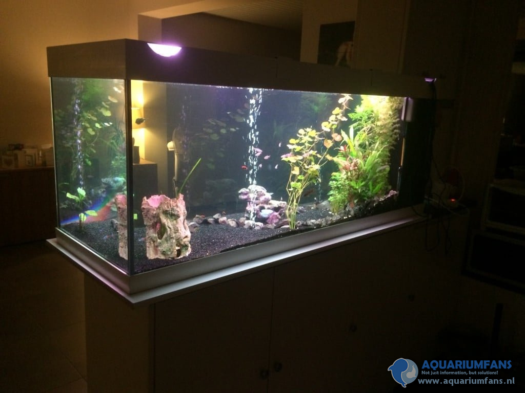 Vorig jaar zomer kwam een vriend van mij met 2 goudvissen een viskom en een zuurstof plant. Paar maandjes later in september heb ik de goudvissen met hun plantje in het zwembad gedaan. Aangezien het zwemseizoen voorbij was en ik geen chloor meer doseerde, zat er uiteindelijk ook geen chloor meer in. Dus de 2 gingen van een kom van een aantal liters naar een oceaan van 28.000 liter. Daar hebben ze met z'n 2e gezeten en zijn ze in 3 maanden tijd flink gegroeid. Ze waren ook goed actief. Jammer genoeg moesten ze rond december eruit aangezien het zwembad winterklaar moest. Toen heb ik via marktplaats mijn eerste bak gekocht(zie foto ) een tetra halfmoon 60 L. Al gauw kocht ik er meer vissen bij, uiteindelijk ging dat niet goed met de goudvis en heb ik de goudvis teruggebracht naar de winkel. Een maandje later wilde ik een grotere aquarium en kocht ik een juwel rio 125 ( zie foto). Nog geen 2 weken later zag ik mijn huidige aquarium op marktplaats staan voor weinig. Ben ik meteen overgestapt en de andere 2 verkocht en er ook nog geld aan verdient.