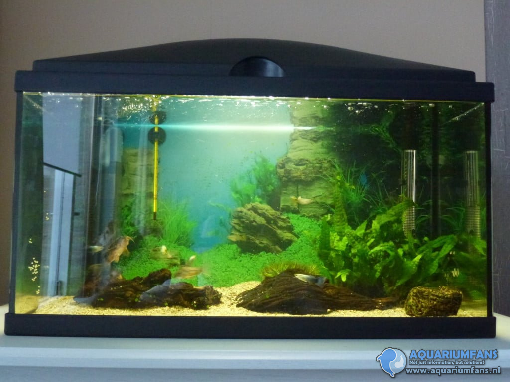 Van kennis twee verwaarloosde goudvissen, die in een vaas zaten, gered en 60x30x30 aquarium gekocht. Bij wat info zoeken bleek dat deze afmetingen onvoldoende zijn voor goudvissen. De goudvissen zijn verhuisd naar de vijver, dat kon niet eerder, omdat we ze midden in de winter overnamen. Na verder zoeken op het web gezelschapsaquarium ingericht.