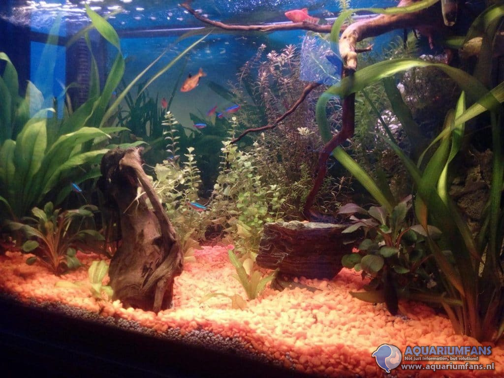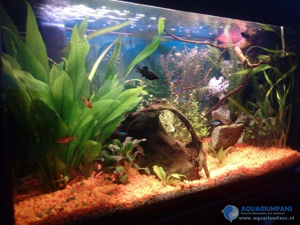 Bovenstaand is mijn aquarium welke al 12 jaar in mijn bezit is. De eerste 11 jaar daarvan was ik een schande onder de aquarianen omdat ik in die tijd een keer of 4 een halfslachtige poging deed er iets van te maken om het vervolgens volledig te laten verslonzen, leeg te halen, grondig te moeten reinigen (met de nodige schade als gevolg, filterunit niet langer bruikbaar, een lelijke kras op het glas). Ik heb toendertijd voor dit formaat aquarium gekozen omdat het een mooie beginnersmaat is, om te kijken of het wat voor mij is. Dat was het dus lange tijd niet…shame on me. Nu eindelijk ben ik sinds een klein jaar er wel echt aandachtig mee bezig en dat betaald zich 100% terug in wat je te zien krijgt! Stiekem droom ik al van een groter aquarium, maar eerst is er nog veel te doen en te leren met deze 125 liter.
