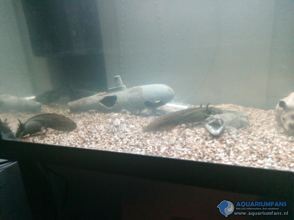 In dit aquarium heb ik gekozen voor een (vrij fijne) grind als ondergrond, een "schuilplaats" van ongeveer 20cm lang en planten komen (zeer) binnenkort ook. Ik heb 2 axolotls in dit aquarium (het is zo naar mijn mening een beetje saai dus als iemand weet wat ik er eventueel aan vissen bij kan doen vertel het me)