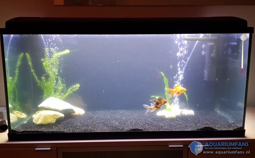 Als klein kind had ik voor mijn verjaardag een leuk vaasje gekregen met een plantje, steentjes en 2 goudvisjes. Hartstikke leuk natuurlijk om naar te kijken, maar voor de arme visjes wat minder prettig. Toen ik had gehoord dat het erg zielig is om een vis in een (ronde) vaas te houden, had ik besloten mijn 2 goudvissen vrij te laten in de vijver van mijn oma. Ik was toch erg geïnteresseerd in vissen geworden, vooral sluierstaarten vind ik geweldig. Ongeveer 10 jaar later (toen ik ben gaan samenwonen met mijn vriend) heb ik besloten dat ik toch graag een aquarium wou hebben met sluierstaarten. Zodoende ben ik op marktplaats gaan zoeken voor een "goedkoop" tweedehands aquarium. In mijn omgeving heb ik toen een lek 1 meter aquarium gevonden die ik gratis kon ophalen. Het aquarium kwam met een werkende lichtkap en een klein aantal gebruikkrassjes op het glas. Maar voor te beginnen vond ik dit wel prima. Omdat het lek was moest ik het natuurlijk opnieuw gaan kitten. Ik heb een beetje moeite moeten doen, maar ik heb nu een mooi aquarium in de woonkamer staan die ik gratis van marktplaats heb opgehaald, alleen de aquariumkit koste dan 8 euro. Na een paar weken indraaien en regelmatig water verversen, ben ik mijn 2 sluierstaartjes gaan halen bij de intratuin hier. En ik ben er nog steeds helemaal verliefd op! Ik ben zelfs al aan het sparen voor een groter aquarium!