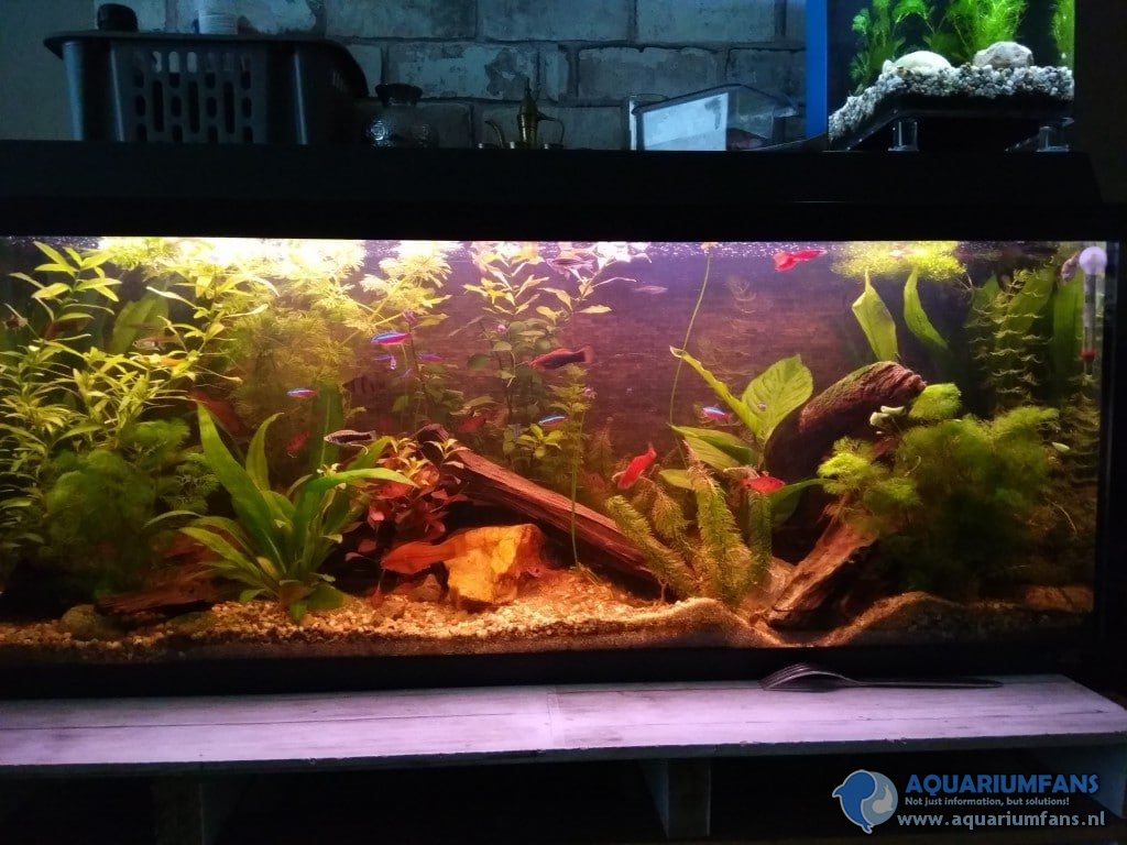 Ik zie een sfeervol, natuurlijk ingericht gezelschapsaquarium. Ik zie ook dat er relatief veel vissen gehouden worden. Misschien wat minder soorten en wat grotere scholen. Maanvissen zijn ook scholenvissen en moeten eigenlijk minstens met 4 – 6 samen gehouden worden. Het water kleurt wat bruin. Komt dat door het hout? Ook zie ik een kaamlaag op het oppervlak. Een skimmertje kan dit oplossen of weghalen met een (oude) krant. Veel plezier met de hobby.