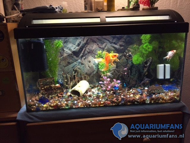 Ik kreeg een sluierstaartvisje in een zielige kom, heb een kleiner aquariumpje gekocht en de vis groeide enorm. Toen maar een grotere bak gekocht en wat gezelschap voor hem, hij is wel een stuk groter dan de andere 3. Ik heb een zwarte skuierstaart met maar 1 oogje, maar die heeft het wel naar zijn zin in deze bak.